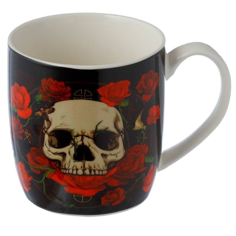 Kubek wewnątrz jest biały. Nadruk zewnętrzny ma czarne tło, na którym widać czaszkę i czerwone róże.